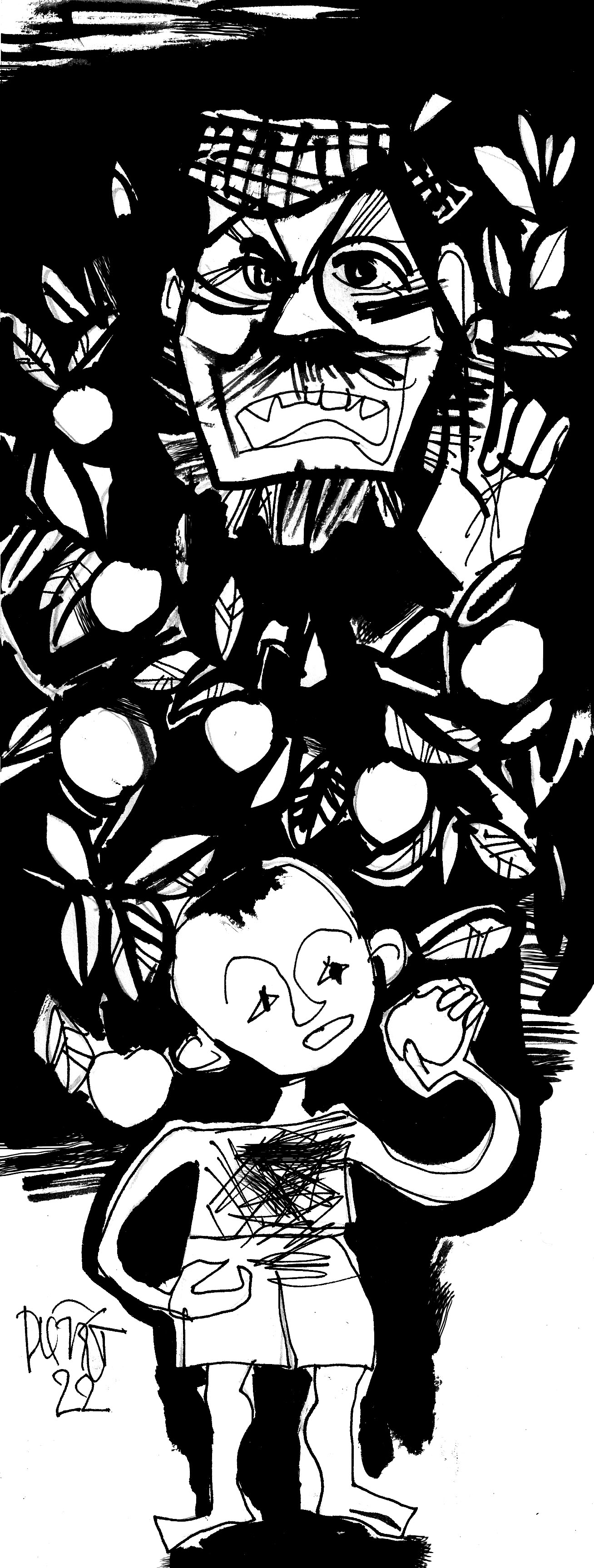 Ngoài việc được cho ăn ra thì xóm này nói chung là chán so với xóm chợ của tôi lúc trước, cho đến ngày tôi khám phá ra cái vườn ổi ấy. Nó kỳ diệu cỡ như tìm ra một châu lục mới. Mười mấy hàng ổi thẳng tắp, cây nào cây nấy thâm thấp mà trái thì to đùng láng lẩy. Những cây ổi khác mà tôi đã thấy toàn cao chót vót, có cho không cũng chưa chắc hái được mà ăn. Vậy là tôi ăn một mạch quên mất đó không phải là vườn của nhà mình. Tôi quên cho đến khi một người đàn ông phương phi râu ria lồm xồm như ông Kẹ bất thình lình xuất hiện bên cạnh tôi, ổng hỏi như thét: “Con ai?”. Tôi thất kinh bạt vía, giữ nguyên trái ổi đang cắn dở trong miệng, hai chân đánh vào nhau.